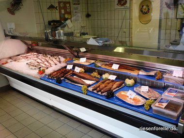 täglich frische und geräucherte Forellen, Lachsforellen, Lachs, Karpfen, Aal, hausgemachte Fischfrikadellen, Soßen, Marinaden usw. Filets der einzelnen Fische. Auch räucherfertig eingelegte Forellen können bei uns bestellt werden! Ein Highlight in den Sommermonaten unsere grillfertig gewürzten Forellen!